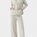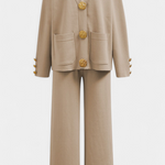 A refined proposal that combines comfort and timeless style. Aireen stands out with a cardigan featuring classic lines and subtle details that elevate any outfit. The wide-leg trousers with an elastic waistband provide fluidity and a flattering fit, while their neutral tones ensure endless versatility for different moments of the day.
