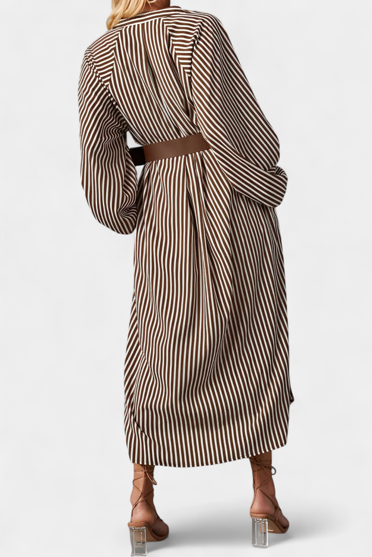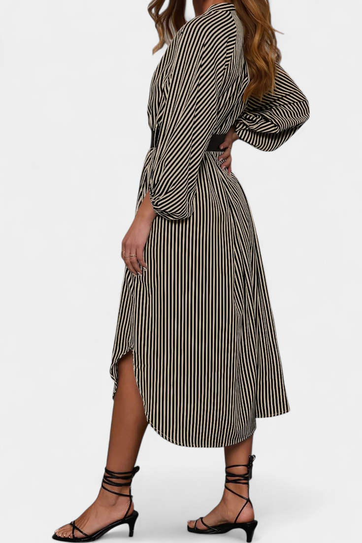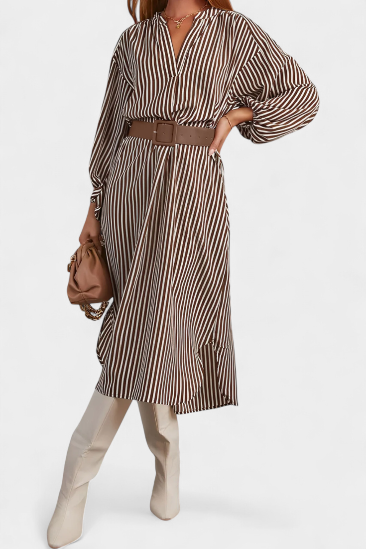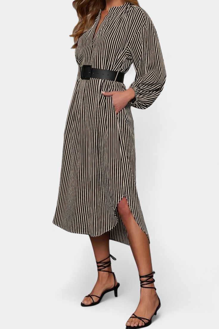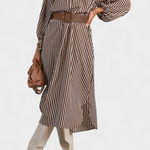 A modern proposal that combines functionality and refined style. Eliana stands out with a pattern of vertical stripes that elongate the silhouette, a notched collar that adds character, and long sleeves that balance the design. The adjustable belt defines the waist, while the pockets add a practical and contemporary touch.