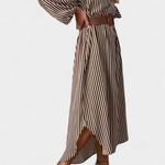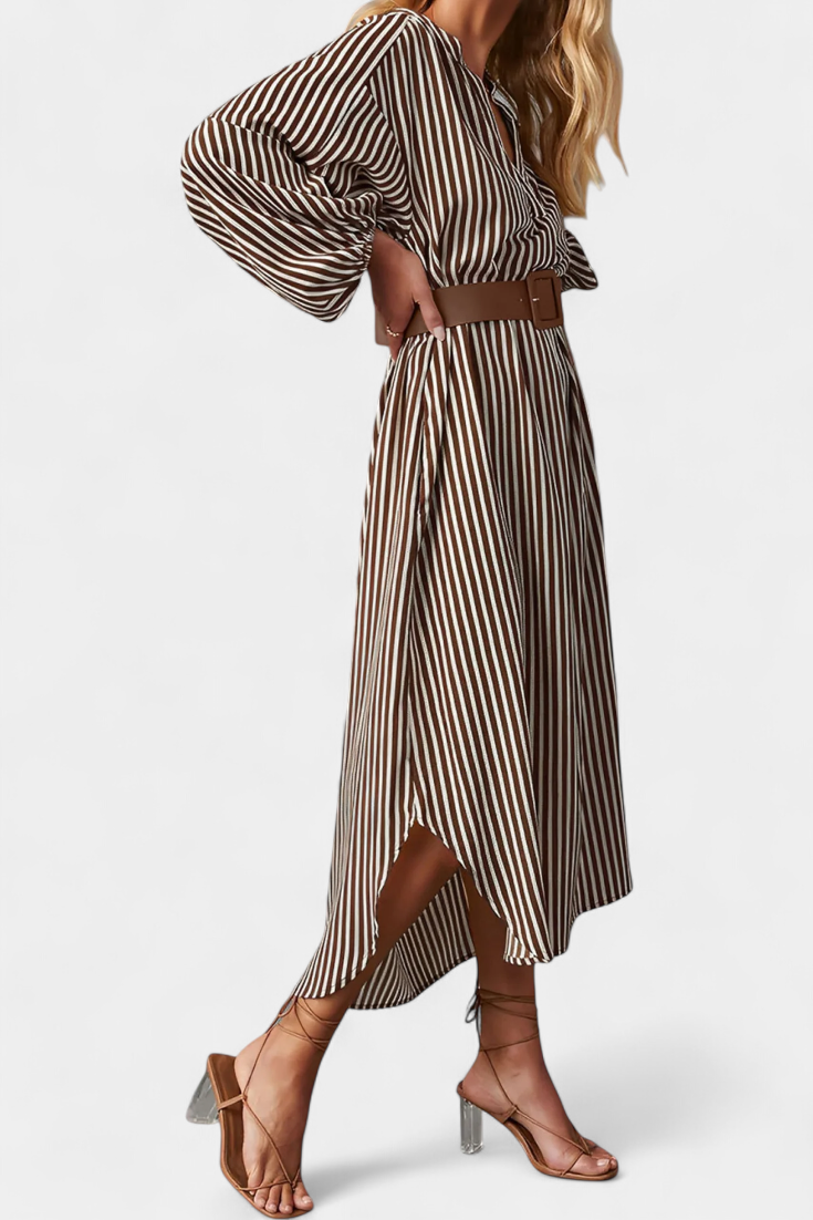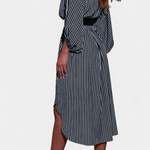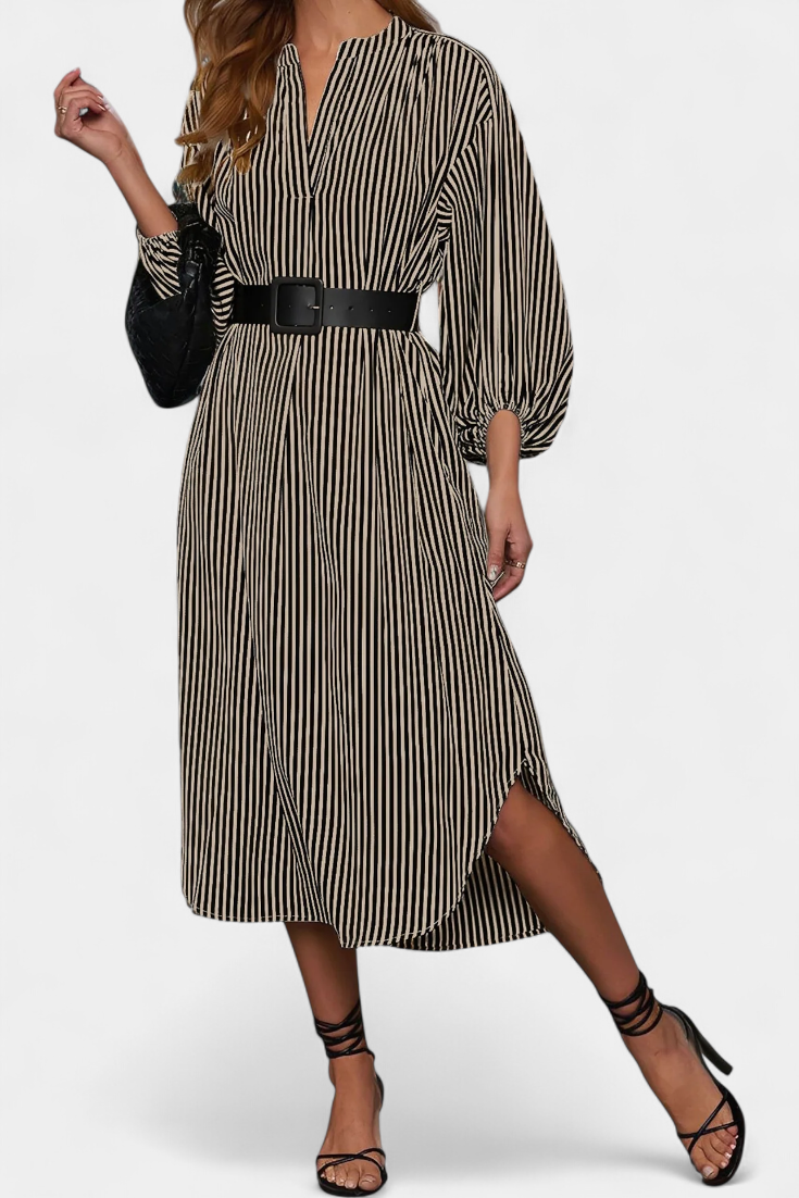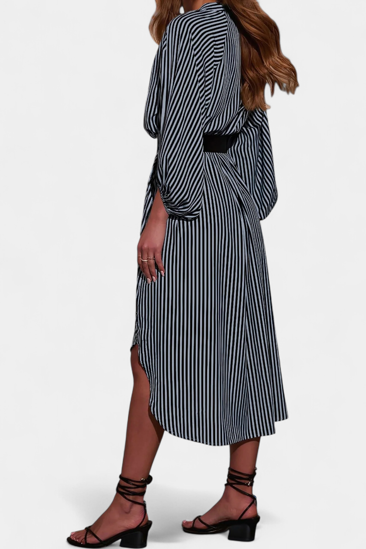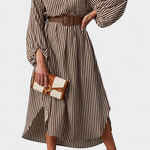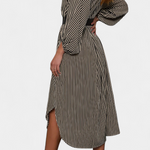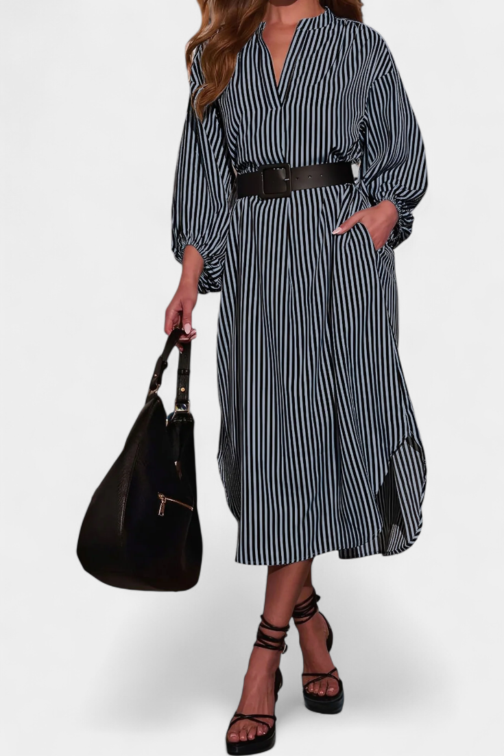 A modern proposal that combines functionality and refined style. Eliana stands out with a pattern of vertical stripes that elongate the silhouette, a notched collar that adds character, and long sleeves that balance the design. The adjustable belt defines the waist, while the pockets add a practical and contemporary touch.