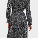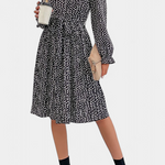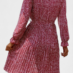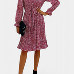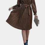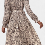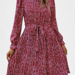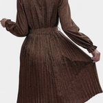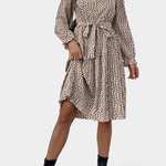 A bold proposal with a refined air. Evabeth stands out with a leopard print that brings strength and personality, balanced by a classic round neck and long sleeves that add sobriety. Its pleated skirt flows gracefully, creating a perfect contrast between dynamism and elegance.