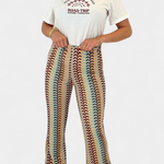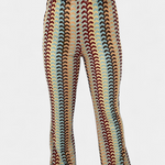 Bold, comfortable, and full of style. The Carlie trousers stand out with their multicoloured wavy print and stretchy spandex fabric that gently hugs your figure. Their flared cut and high waist visually elongate the legs, creating a modern look with vintage nods. Ideal for elevating a casual outfit with personality.
