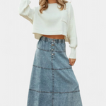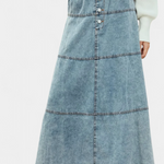Casual, original, and with a chic twist, Lorraine reinvents the denim skirt with character and movement. The flowing long cut, marked seams, and feather detail create a balance between the classic and the unexpected, ideal for casual looks with intention.