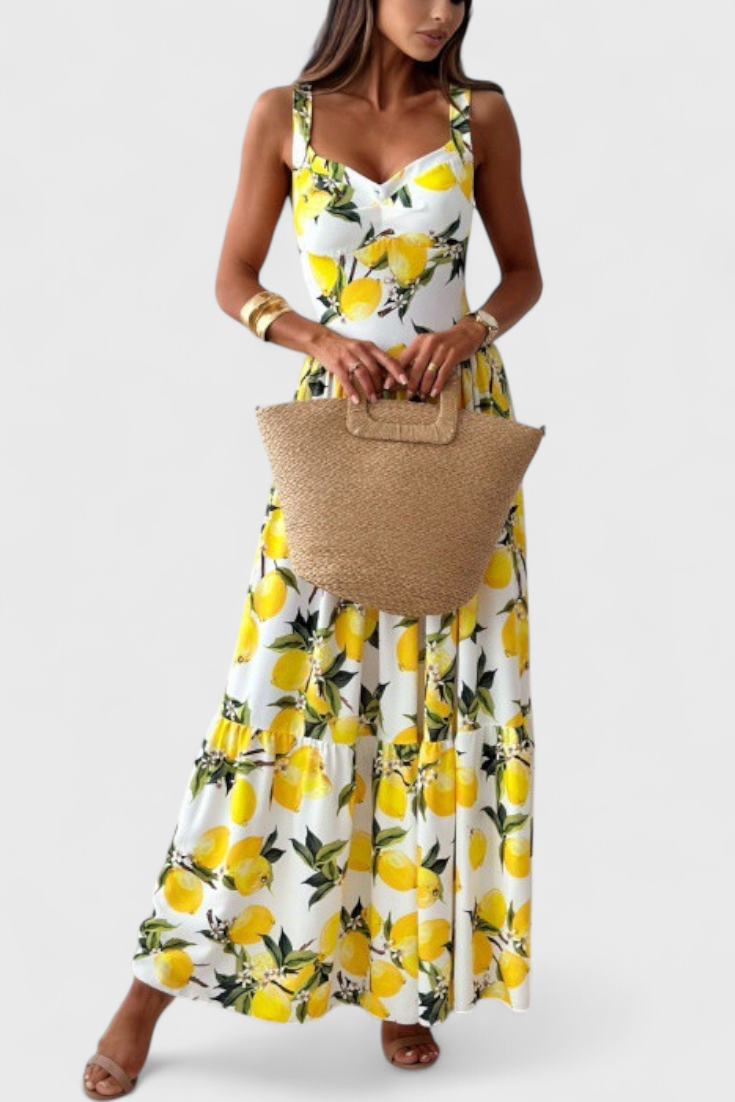 Huda Lemon Print Maxi Dress with Straps and Side Split