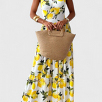 Refreshing, bright, and full of character, the Huda dress is a celebration of summer with its vibrant lemon print and flowing silhouette. Designed with thick straps and a sweetheart neckline that flatters the figure, its skirt with a side split adds movement and effortless sensuality. A design that conveys joy and natural elegance for sunny days and stylish getaways.