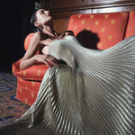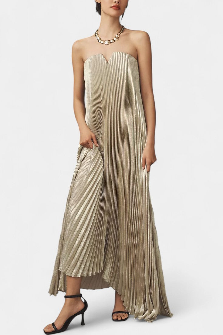 Designed to stand out with grace and structure. The Andreia dress blends defined lines and fluid movement in an A-line silhouette that flatters effortlessly. The notch sweetheart neckline adds a sculptural touch, while the knife pleats bring dynamism and elegance to every step.