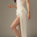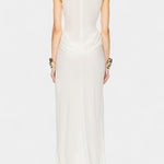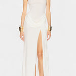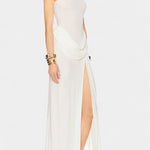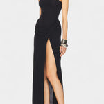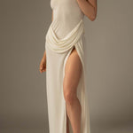 A piece that radiates luxury and sophistication. The Duchess is distinguished by its draped design that adds fluidity and architectural elegance, while the side slit accentuates the silhouette with a sensual and confident touch. Designed to shine with every movement, it is the perfect choice for moments when you want to capture all eyes.