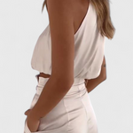 Sophisticated minimalism with a light and relaxed feel. The Helira set reinvents comfort with a clean, feminine silhouette. Its sleeveless top with structured neckline and wide pleated trousers create a balance between freshness, style, and freedom of movement. Ideal for those seeking a polished look without effort.
