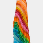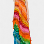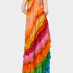 - Details: Halter neckline, cascading ruffles, multicolour tie-dye print