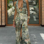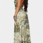 A dress that exudes magnetism. Zephyra combines the delicacy of lace with the boldness of a deep halter neckline and a flowing silhouette that opens up with a dramatic side split. Its butterfly-inspired print adds an ethereal touch, perfect for moments when you want to leave an unforgettable impression.