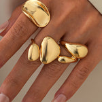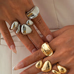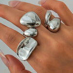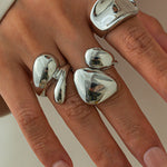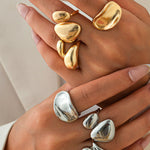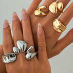 Modern and expressive, this set of irregular metal rings showcases organic shapes and sculptural lines. Each piece adds an artistic touch to your look, perfect for stacking or wearing alone to highlight your unique style.