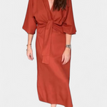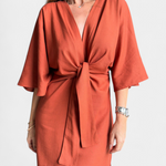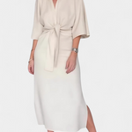 Simplicity that captivates with a silhouette designed to stand out naturally. The Ainhoa dress combines a deep V-neck with kimono-style sleeves and a central knot that gently frames the waist. Its structured fabric and functional design make it a versatile and elegant essential.