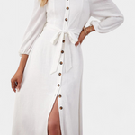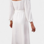 The Leonor dress combines relaxed femininity with classic details. Its straight neckline with off-the-shoulder design elegantly frames the neck, while the front buttoning and tied belt subtly accentuate the silhouette. The long sleeves and airy fabric make this garment a perfect choice.