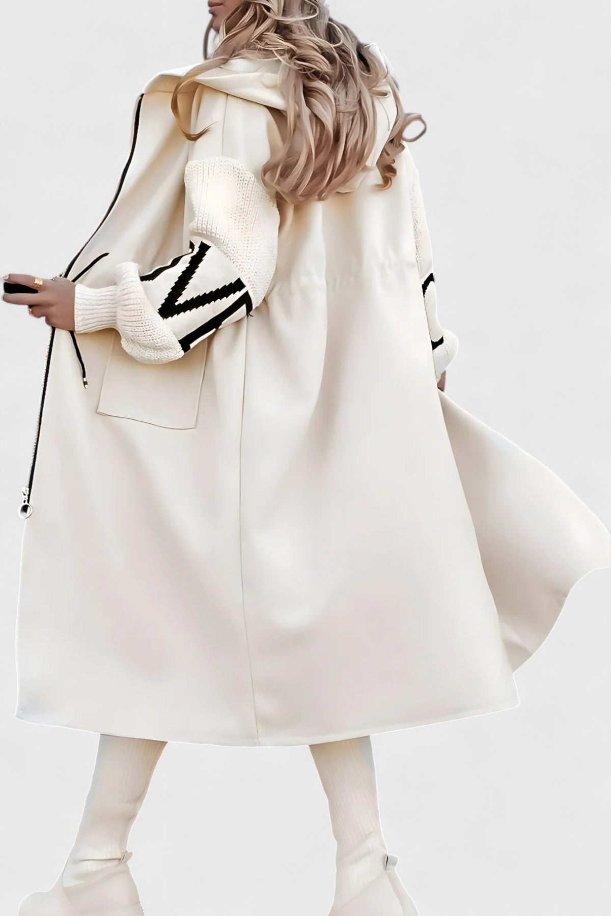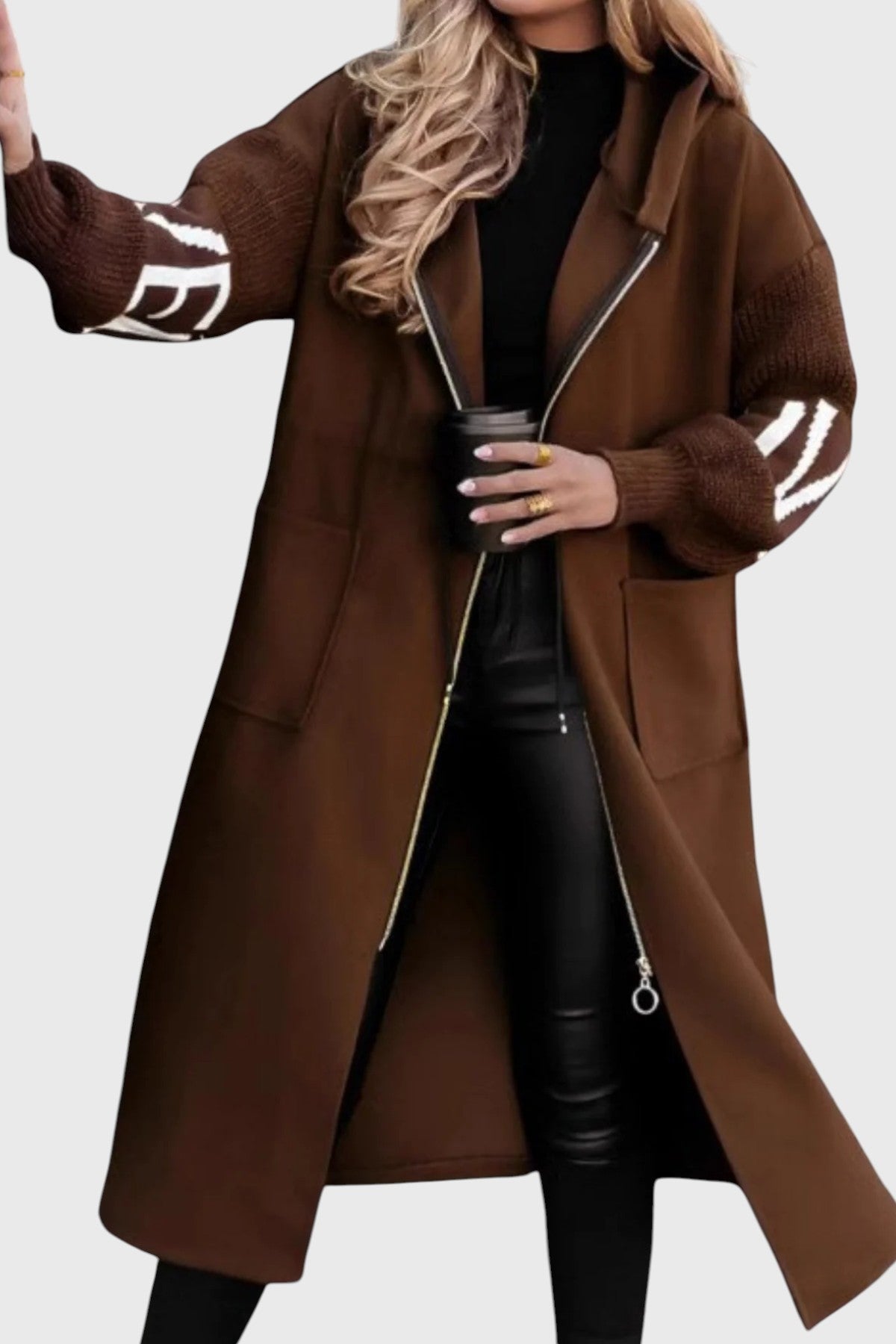 Made from a high-quality wool blend and premium fabric, it ensures a soft touch, warmth, and durability for everyday wear. Its knitted sleeves with geometric patterns add personality and an elegant contrast, making it a must-have for the colder days.