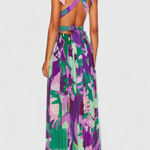 Fluid, vibrant and full of character. The Cecil dress combines an artistic print in lilac and green tones with a light, open silhouette that moves elegantly. Its deep neckline, open back, and pleated details make it a standout piece for events, holidays, or special evenings outdoors.