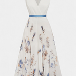 The Elise dress combines classic romance with modern freshness. Made from white chiffon with a floral print, it features a flattering V-neckline, A-line silhouette, and delicate pleats that add texture and flow. The adjustable belt accentuates the waist, while the full lining and back closure ensure comfort and structure throughout the day.