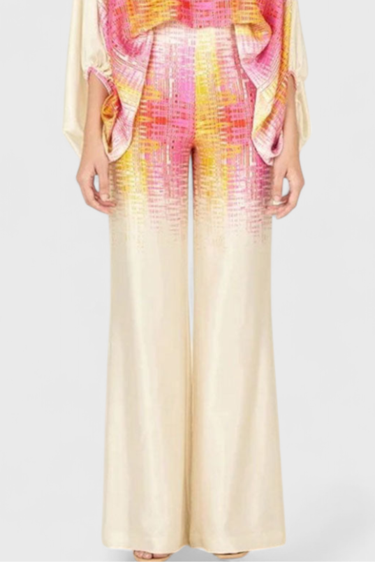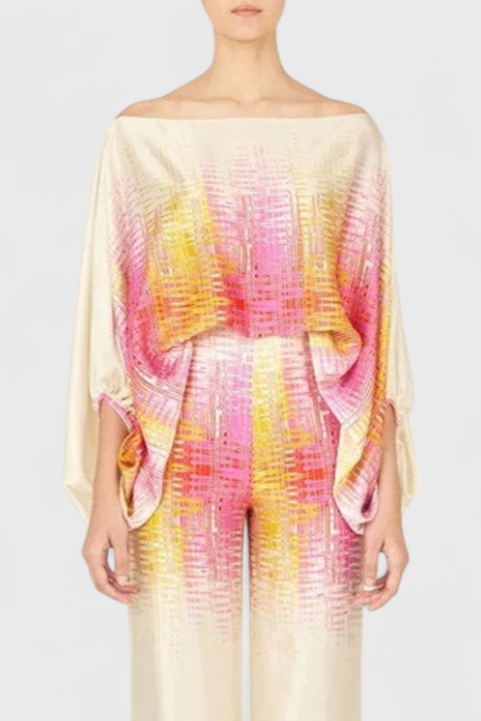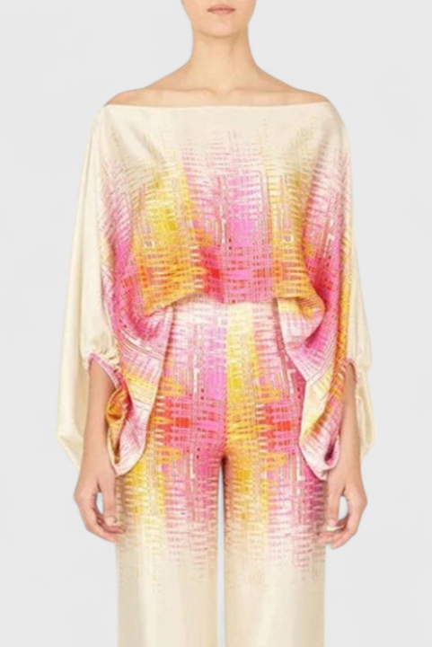 The Sybella set combines an off-the-shoulder blouse with puff sleeves and wide-leg trousers featuring an artistic print. Designed to offer a flowing silhouette with personality, it is perfect for sunny days, relaxed getaways, or stylish gatherings.