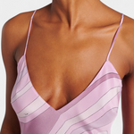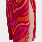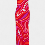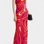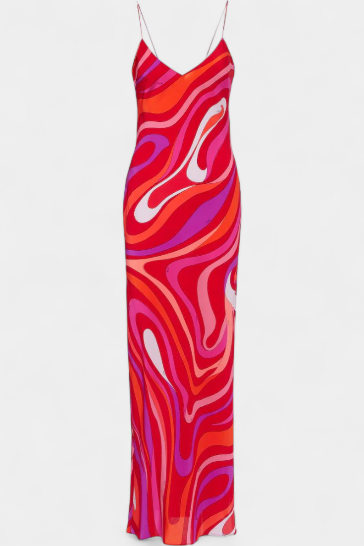 A bold design that conveys movement and energy. The Valera dress stands out with a retro-psychedelic swirl print in vibrant tones, merging artistic style with a flowing and feminine silhouette. Its sleeveless cut adds freshness, while the shiny fabric enhances the intensity of the design and the long skirt moves gracefully with every step.