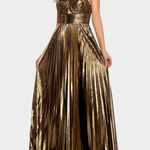 The Aikaterini dress shines with majestic presence thanks to its metallic fabric, crossed neckline, and front slit with strategic pleats. The wide silhouette elegantly falls to the ankles, creating an ethereal movement with every step. A piece designed to stand out under the lights and leave a lasting impression at any event.