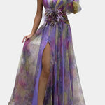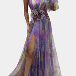 A style statement for events that demand presence. The Amelie dress combines a sculptural design with ethereal details, from its asymmetrical neckline to the draped skirt with a front slit. The watercolour print and floral appliqué at the waist elevate its elegance, creating an unforgettable silhouette for sophisticated celebrations.