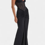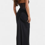 A two-piece set designed to sculpt the silhouette with refined sophistication. Angelina combines a structured mesh corset with underwire and an adjustable deep halter neckline, providing support and definition. The ruched maxi skirt elegantly falls to the floor, creating a fluid movement that balances sensuality and modern luxury.