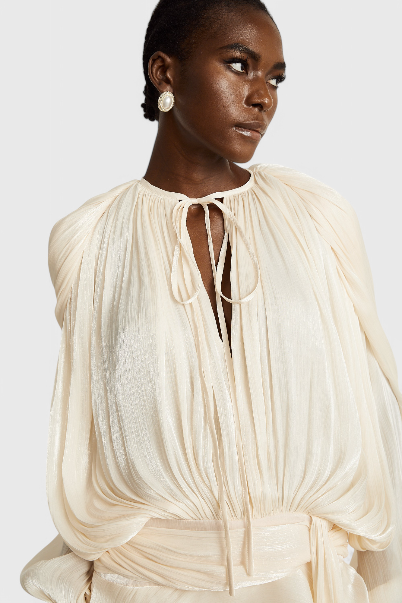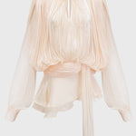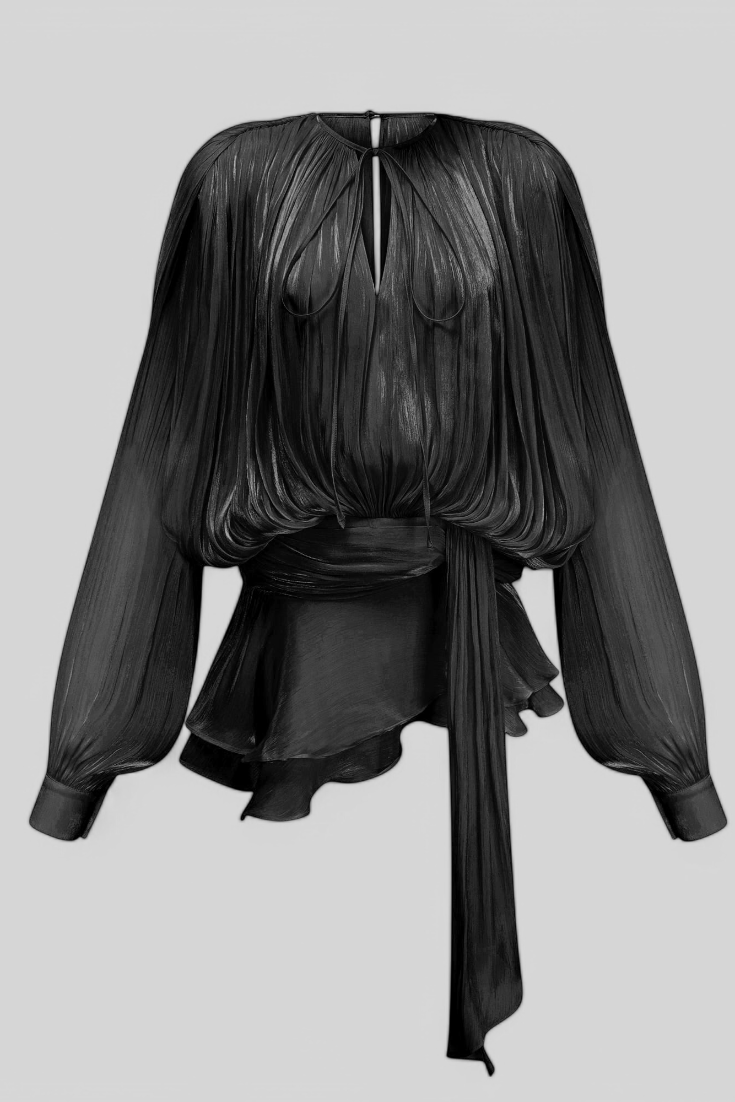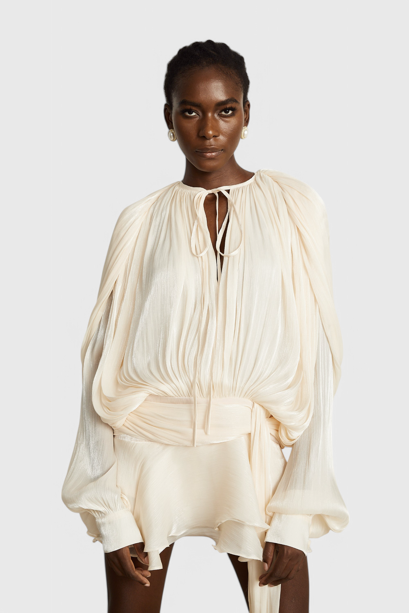 - Long sleeves with buttoned cuffs and a bow tie closure at the neck for added refinement