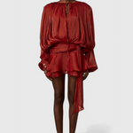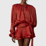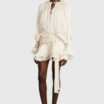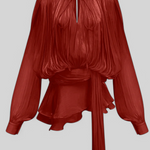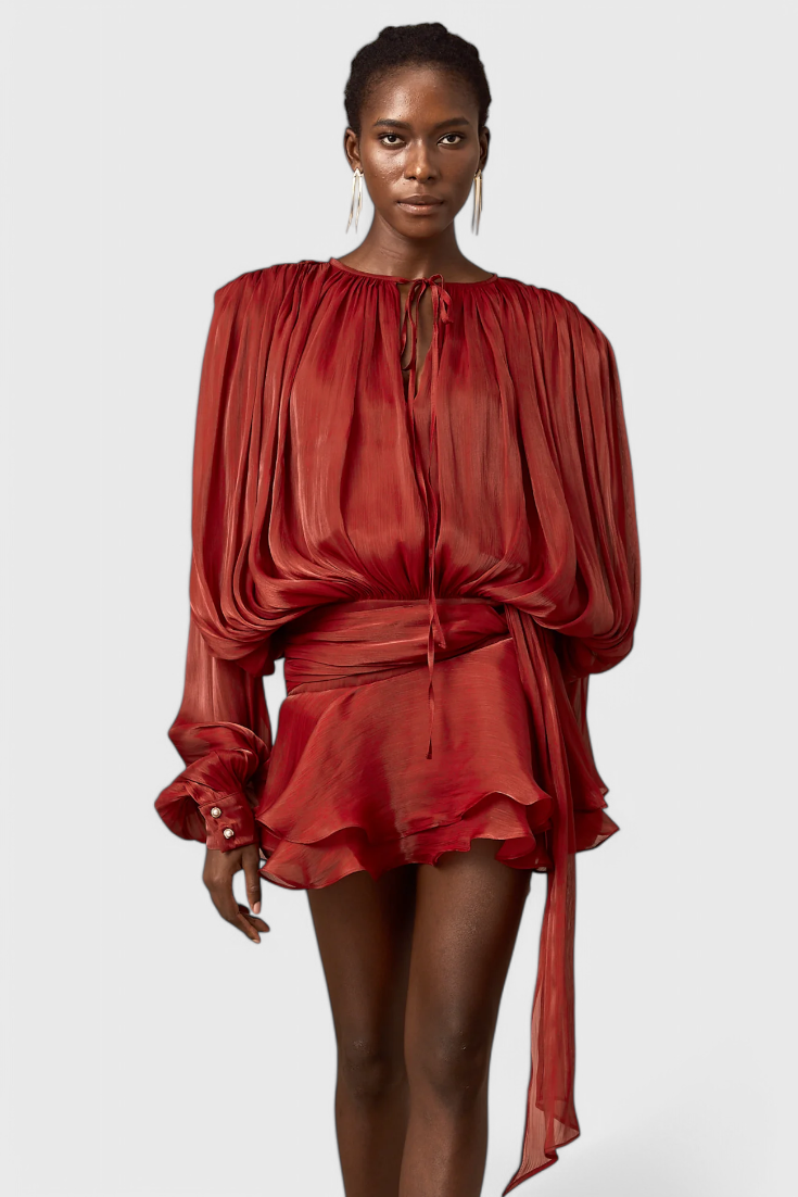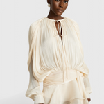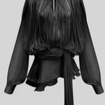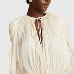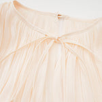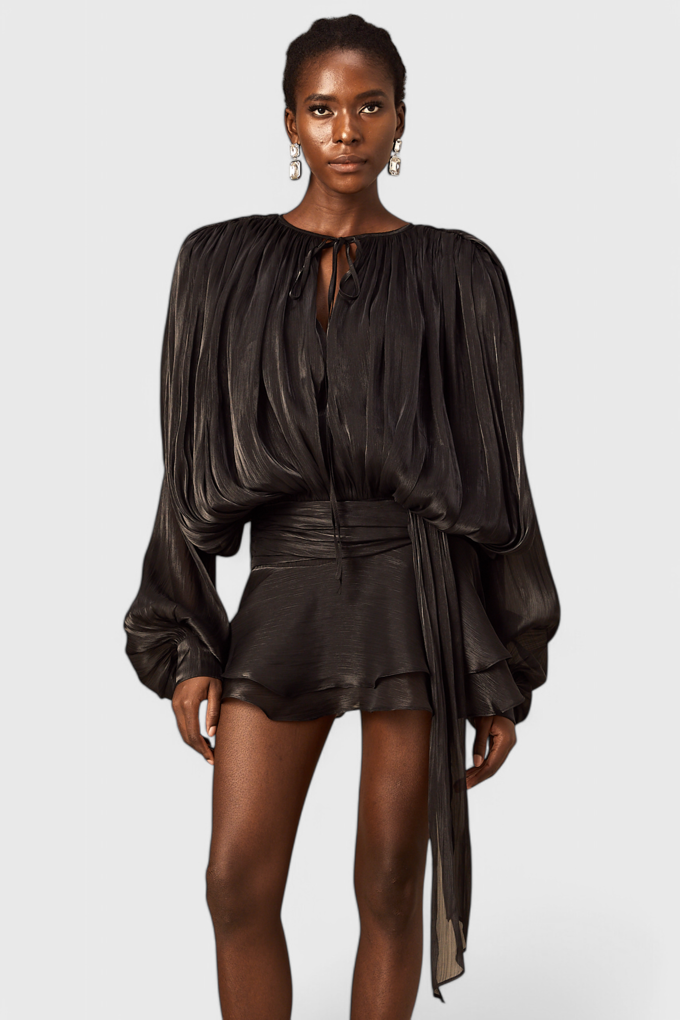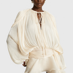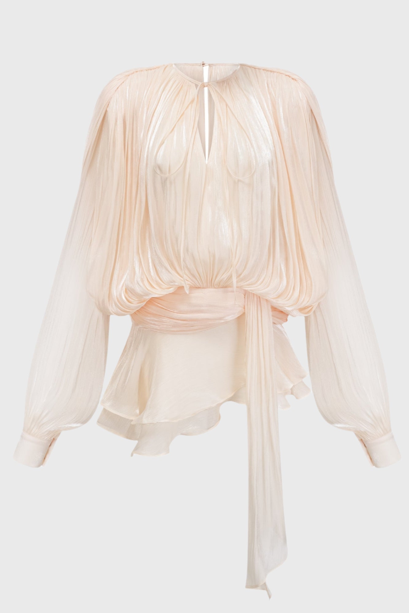 - Long sleeves with buttoned cuffs and a bow tie closure at the neck for added refinement