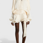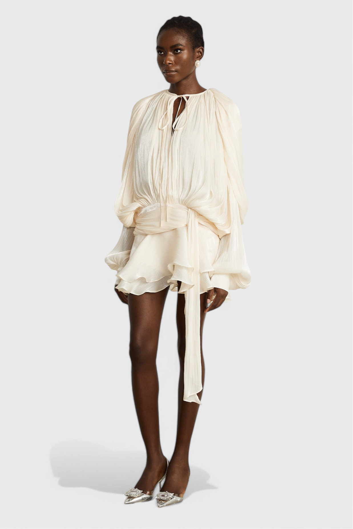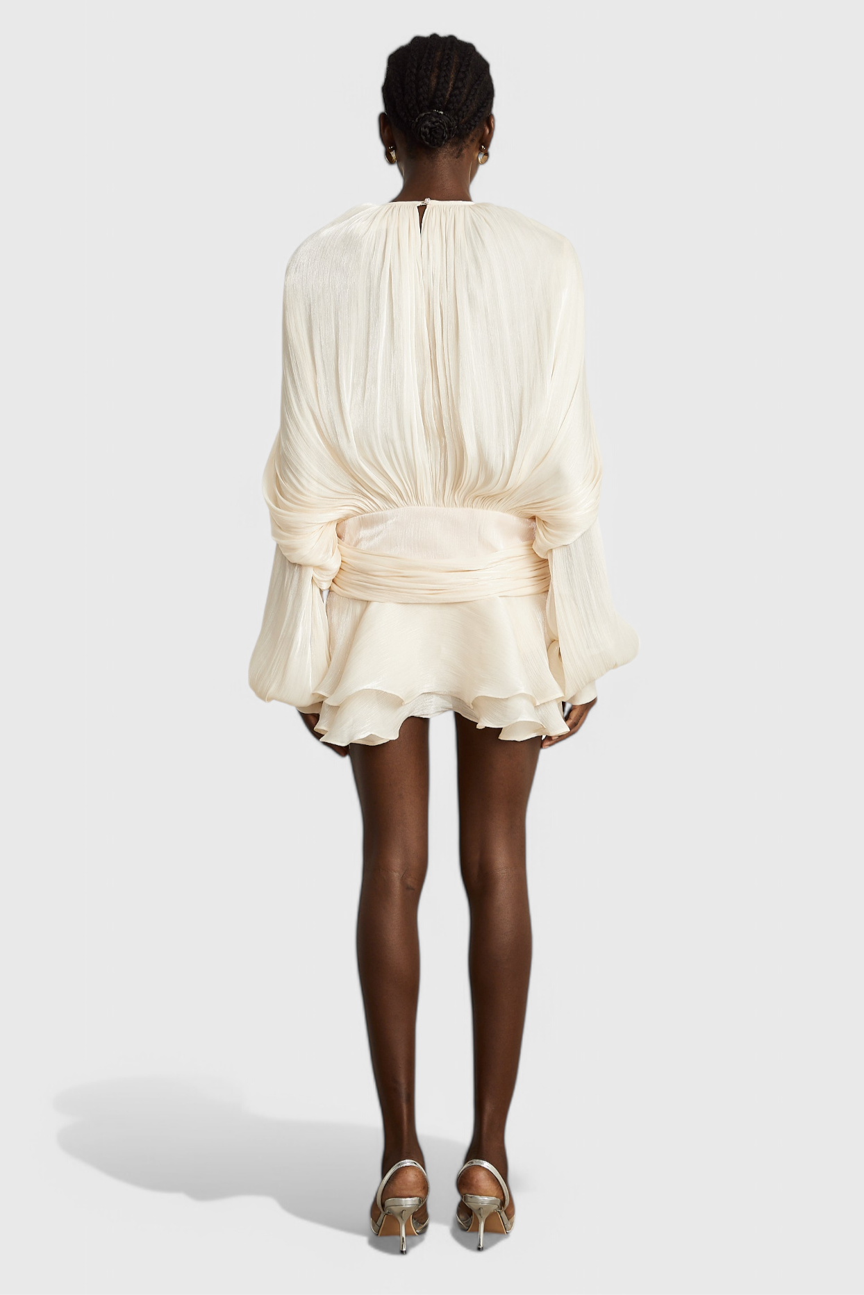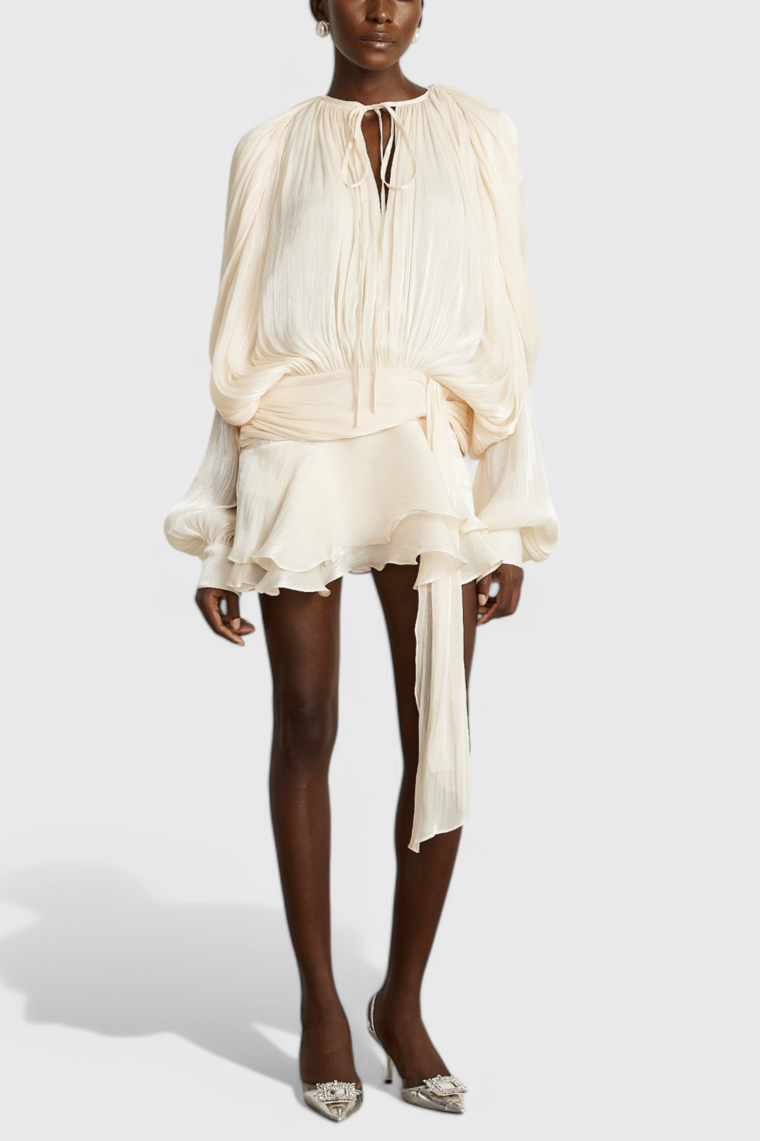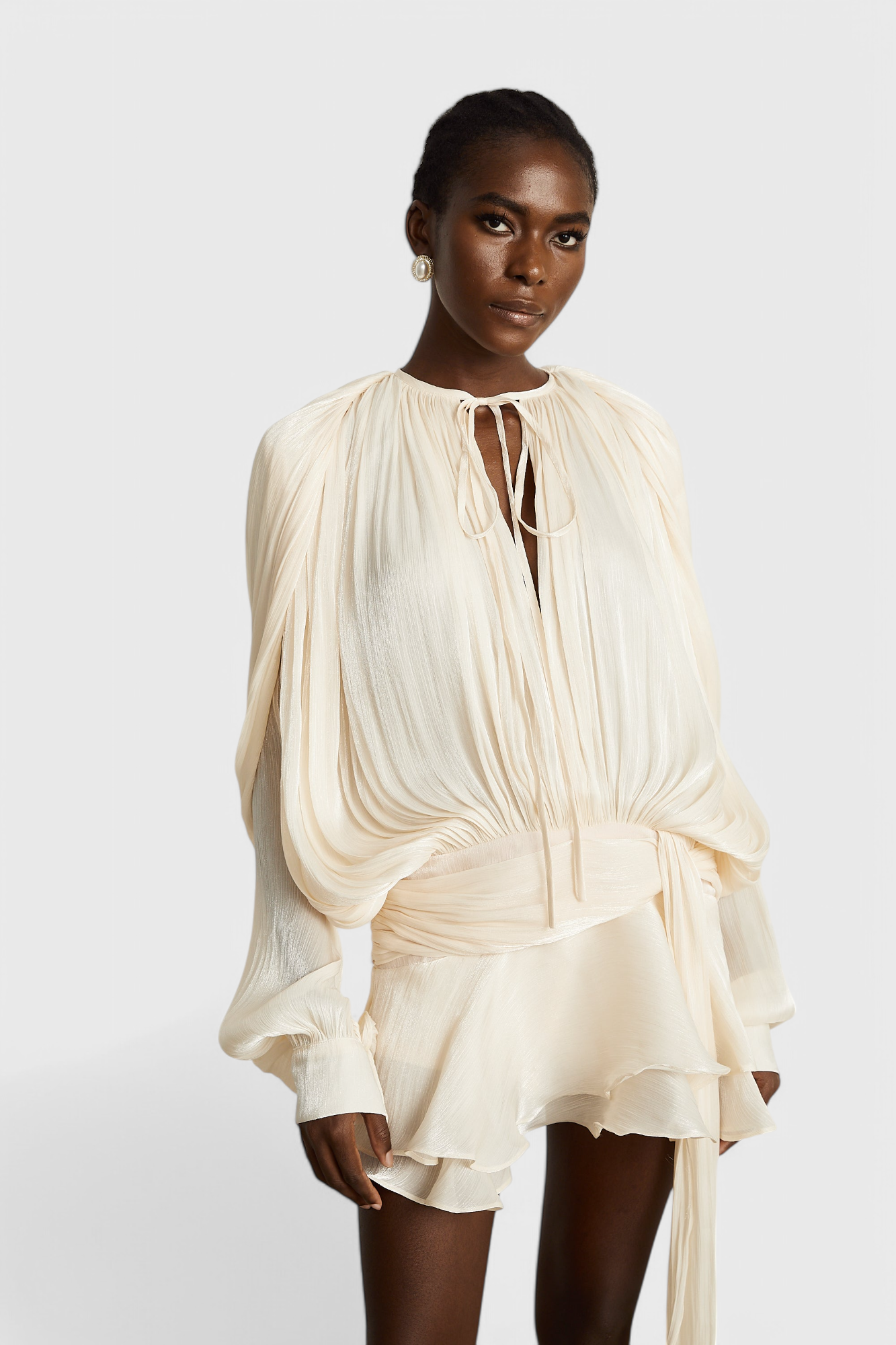 Modern elegance meets playful texture in this eye-catching mini dress. Designed in a soft neutral tone, it features fully pleated fabric, a flattering twist detail, and delicate sparkly accents that catch the light. The draped silhouette is enhanced with shoulder pads for added structure, while the ruffled hems add a feminine touch. Perfect for evening events or special occasions.