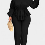 Feminine, versatile, and full of character, the Charmed set combines a long-sleeved top with ruffles and an adjustable cord with fitted trousers. Its silhouette balances comfort and style, creating a contemporary look that effortlessly enhances the figure. Perfect for those seeking a charming modern two-in-one piece.