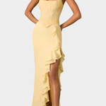 A romantic proposal that combines femininity and sophistication. Cindy stands out with a structured corset that shapes the silhouette, while the asymmetrical ruffle hem adds fluidity and dynamism. Its delicate tone and midi design make it an ideal piece for special moments where you want to shine with grace and style.