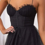 Romantic, elegant, and effortlessly feminine, the Eileen Dress combines structured elegance with a soft and flowing charm. With its fitted corset top and airy tulle skirt, it creates a silhouette that is both timeless and enchanting—perfect for weddings, galas, or any special evening.