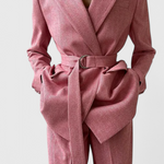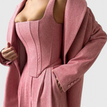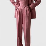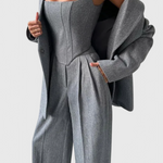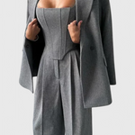 Impressive and versatile, the Evena set redefines modern tailoring with an unparalleled presence. Comprising a impeccably tailored jacket, pleated trousers, and a structured corset-style top, it combines precision in design with sophisticated feminine appeal. The premium fabric with a subtle pattern adds texture and elegance, while the defined silhouette projects confidence and style.