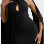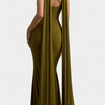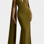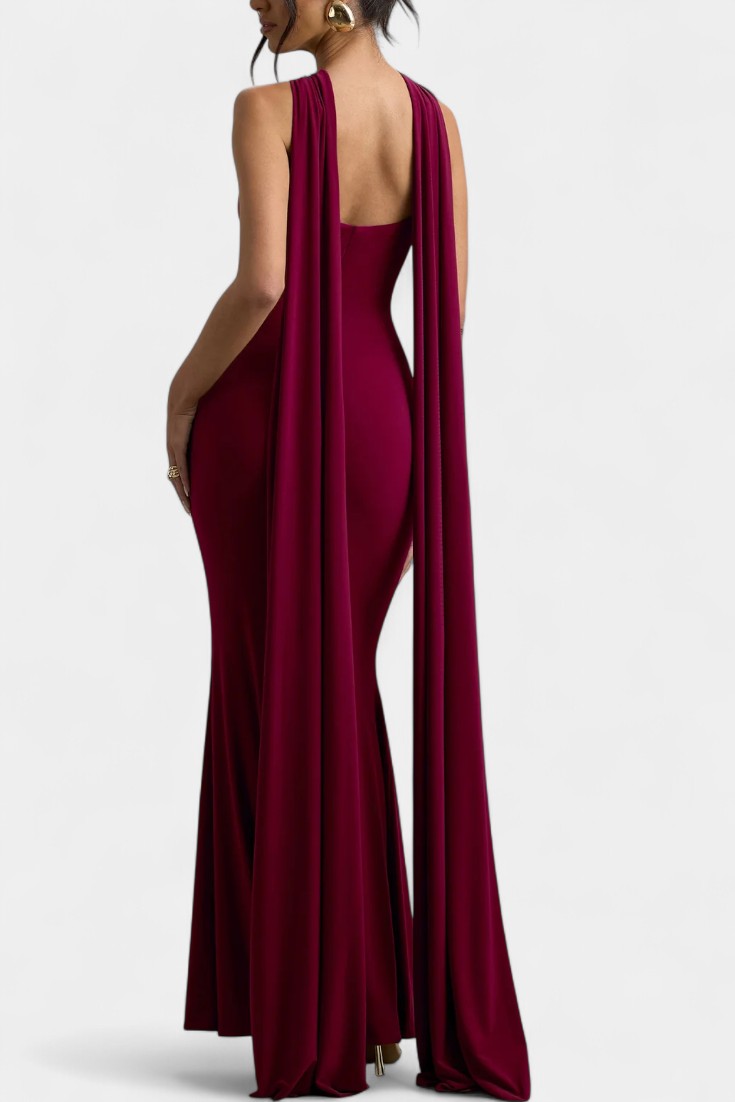 A timeless design that combines classic refinement with modern allure. Faffienia dazzles with its twisted halter neck and a keyhole cut that boldly frames the neckline. The flowing ribbon adds elegant movement, while the double-layered maxi silhouette enhances curves with a flawless finish, perfect for shining at special soirées.