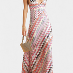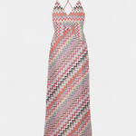 A style icon that dazzles with every thread. The France dress revives the vibrant essence of zigzag stripes with a multicolour knitted design enhanced with shiny metallic threads. Its deep V neckline and crossed straps at the back reveal a perfect balance between sensuality and sophistication, while the long flowing skirt adds an ethereal movement.