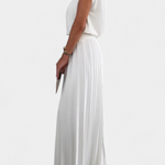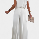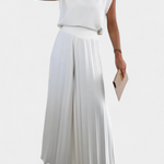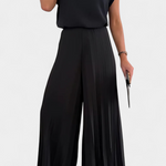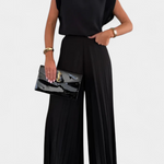 Sophisticated minimalism with a powerful and feminine silhouette. The Liora set features a sleeveless top with an open back and defined shoulder pads, paired with wide-leg pleated trousers that flow elegantly. A perfect fusion of comfort and polished style.