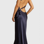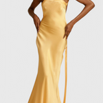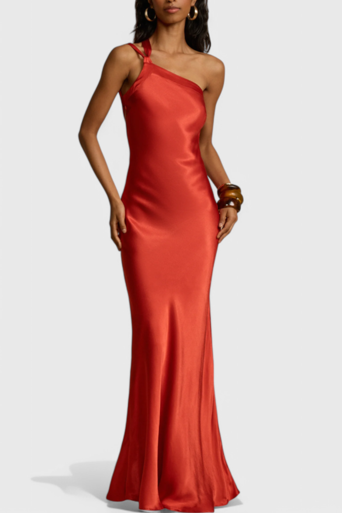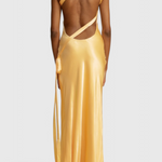 Modern glamour with a silhouette that leaves a mark. The Lucra dress stands out for its elegant floor-length drape and asymmetrical design with an open back that radiates sophistication. Its lustrous, premium fabric adds fluidity and light to every step, making it ideal for nights when you want to stand out with elegance.