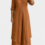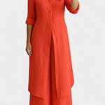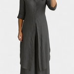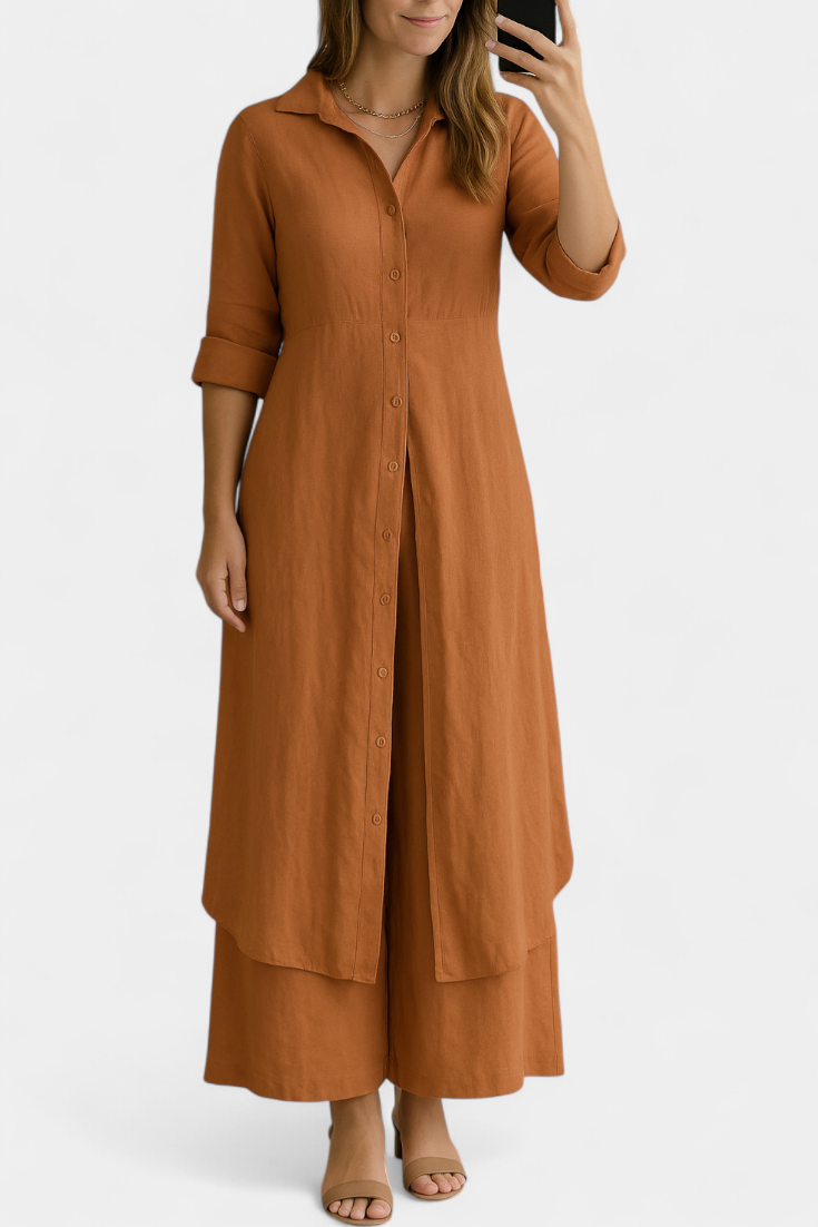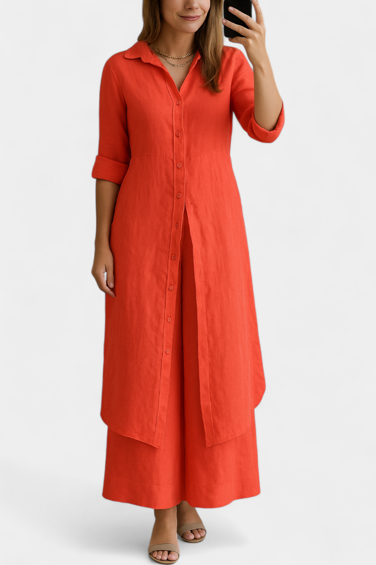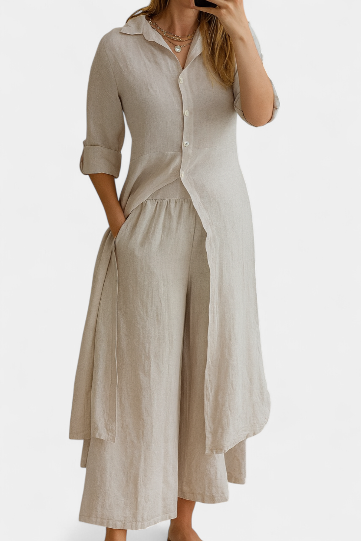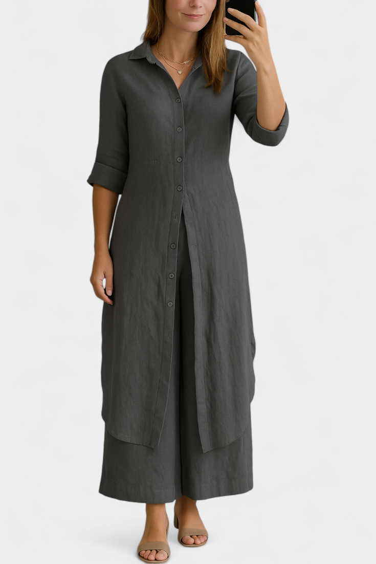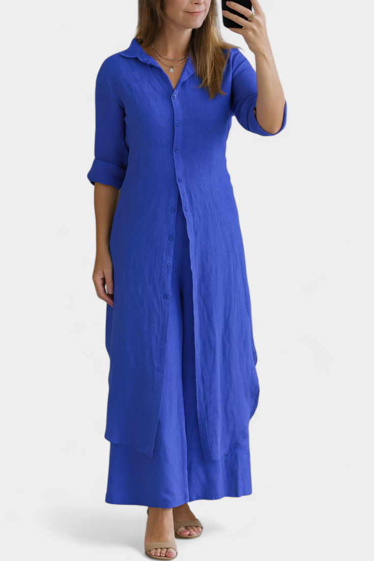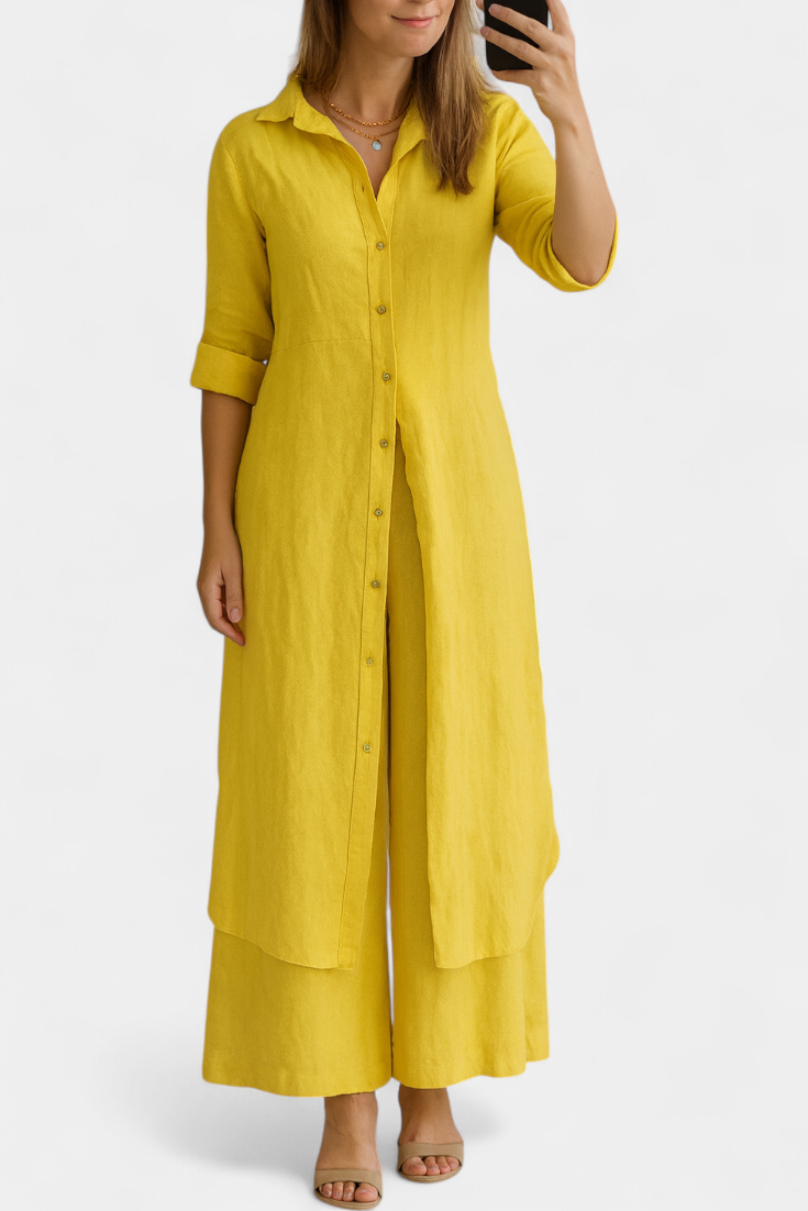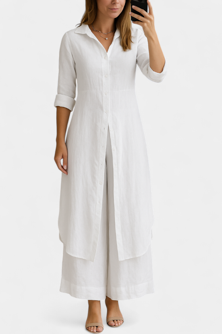 Lightweight, natural, and refined: the Palmer set celebrates the relaxed elegance of pure linen. Comprising a long shirt dress with a classic collar and loose, flowing trousers, it offers a complete look that combines freshness and sophistication with every movement. Made from 100% European linen, it provides breathable comfort and an impeccable presence for warmer days.
