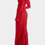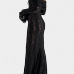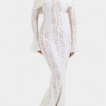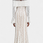 A design that exudes timeless romance. The Rosalie dress combines the delicate charm of lace with an off-shoulder neckline and flared sleeves that add ethereal movement. Its high-waisted silhouette elegantly flatters, offering a refined and sophisticated look for memorable occasions such as weddings, galas, or special evenings.