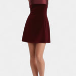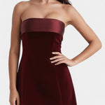 A bold proposal with a sophisticated air designed to turn heads. Sariya dazzles with its structured bandeau neckline and the hammered satin hem detail that adds a luxurious finish. Made from soft velvet and fully lined, it offers a flattering A-line silhouette that combines sensuality and elegance, perfect for evenings when you want to radiate confidence.
