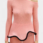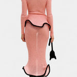 A chic proposal that blends modernity and femininity. Stormi stands out with its one-shoulder ribbed top and delicate contrasting ruffled edges, bringing a playful yet sophisticated air. The coordinated midi skirt, featuring a semi-sheer finish and mirrored details, completes a balanced ensemble that combines boldness and elegance in equal measure.